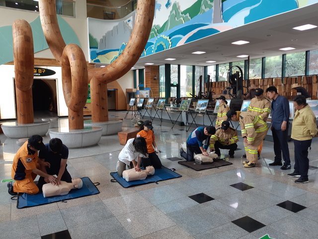훈련은 산림과학박물관 내 화재 발생을 가상으로 화재발생시 신속․정확한 초동 조치, 비상대피 연습, 소화기 및 소화전을 이용한 화재 진압, 소방차 살수 시범을 갖고 응급환자 구조 시 필요한 환자 이송 방법과 심폐소생술 교육을 병행해 실제상황과 같이 생동감 있게 진행했다.