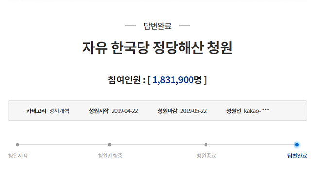 그는 "183만과 33만이라는 숫자에서 주권자인 국민의 답답한 심정을 읽을 수 있다"고 평가했다. 이어 "정당에 대한 평가는 선거를 통해 내릴 수 있음에도 불구하고 이처럼 국민청원으로 정당 해산을 요구하신 것은 '내년 4월 총선까지 기다리기 답답하다'는 질책으로 보인다"고 했다.