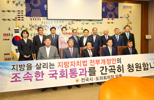 한편, 장경식 경북도의회의장은 지난 3월 국회에 제출된 지방자치법 전부개정안과 관련, 전국 17개 시도의회 의장들과 함께 자치분권 실현으로 지역주민의 삶의 질을 향상시키고 지방의 창의적 혁신으로 균형발전과 국가성장의 새로운 동력을 확보하는 기폭제 역할을 다 할 수 있도록 지방자치법 개정안에 대한 국회차원의 전폭적인 지지와 협력을 요청했다.