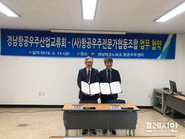 경남항공우주산업교류회 대표로는 김태화 회장이 (사)항공우주전문가협동조합 대표로는 조태환 이사장이 참석해 협약서에 서명했다.