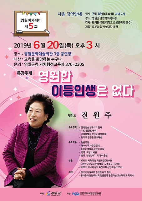 영월군은 오는 20일 오후 3시 영월문화예술회관 3층 공연장에서 탤런트 전원주 씨를 초청해 ‘영원한 이등인생은 없다’ 라는 주제로 영월아카데미를 연다.