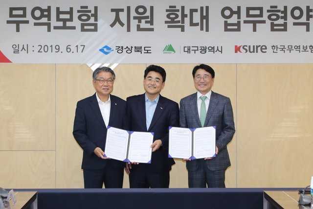 ▲중소기업 무역보험지원 확대 업무협약식 모습(왼쪽부터 이승호 대구시 경제부시장, 백승달 한국무역보험공사 부사장, 전우헌 경북도 경제부지사) ⓒ경북도