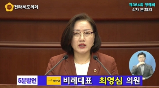 전북도의회 최영심 의원(정의당)은 19일, 5분 자유발언을 통해 "전주 종합경기장 개발의 첫 단추를 잘못 끼운 책임을 따지면서 전주시의 개발계획을 철회하고 전액 국비사업으로 제대로 추진할 것"을 촉구했다.