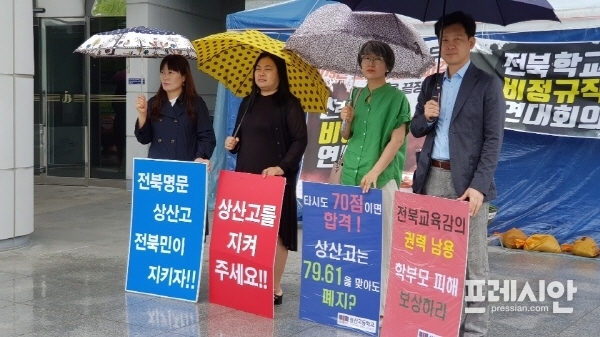비가 내리는데도 불구하고 전북도교육청 한켠에서 피켓시위를 하고 있던 상산고 학부모들과 전북도교육청의 상산고 재지정 취소와 관련된 얘기를 나눠 봤다.