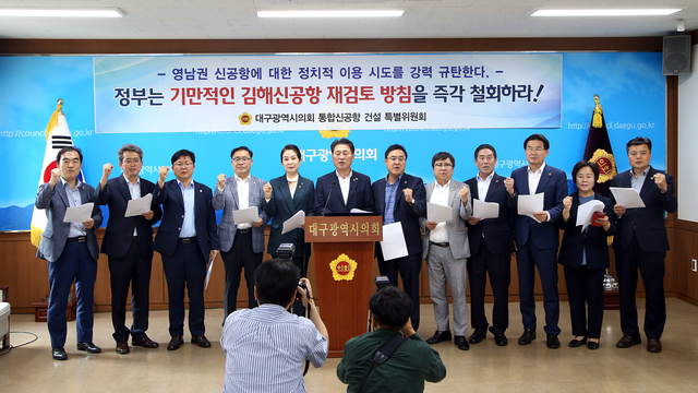 대구시의회 통합신공항 건설 특별위원회(위원장 홍인표)는 25일 대구시의회에서 통합신공항 건설 특위 위원 및 배지숙 시의회 의장을 비롯한 시의원들과 함께 “영남권 신공항에 대한 정치적 이용 규탄 성명서”을 발표했다.
