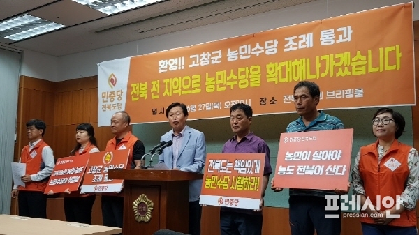 민중당 전북도당은 27일, 전북도의회 브리핑룸에서 기자회견을 갖고 "농민들에게 실익을 줄 수 있는 농민수당의 조기시행"을 전북도에 촉구했다.