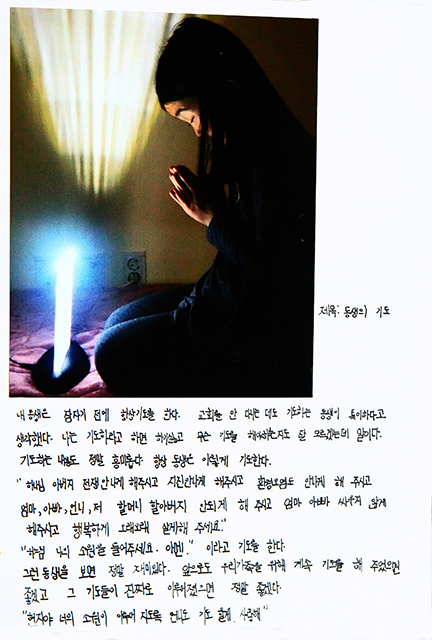 전다정 학생의 ‘동생의 기도’는 전쟁, 지진, 환경오염에 대한 걱정에서부터 가족의 화목에 이르기까지 행복을 기원하는 동생의 소박한 기도 내용이 사진과 글을 통해 조화롭게 표현돼 대상으로 선정됐다.