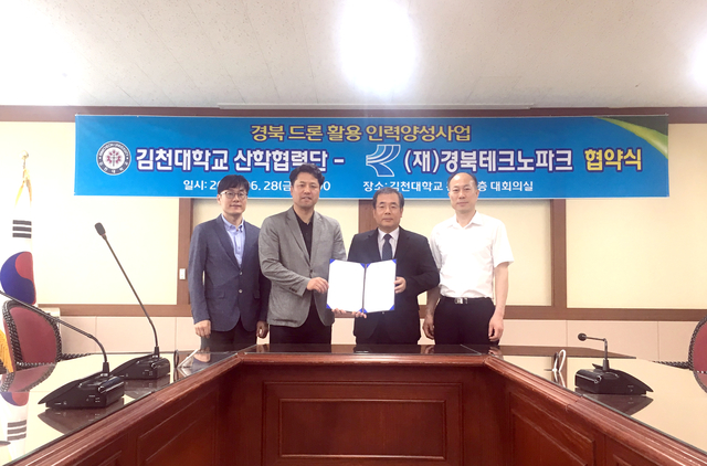 ▲김천대학교(총장 윤옥현)는 28일 (재)경북테크노파크와 ‘2019 드론활용 인력양성사업 협약식’을 체결했다. ⓒ김천대학교
