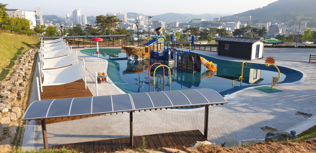 면적 2,084㎡에 군비 12억을 투자해 조성한 물놀이장은 7종의 놀이시설, 바닥분수 1개소, 그늘 쉼터, 간이 샤워시설, 탈의실을 설치했다. 화장실은 간이 화장실 대신 기존 공원 화장실과 동선을 연결해 불편함이 없도록 조치했다.