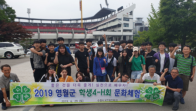 강원 영월군은 청소년들의 건전한 인성과 농심 함양 및 지역 인재 육성을 위해 추진하는 다양한 학교4-H 사업 일한으로 지난달 29일 상동고교, 상동중학교, 녹전중학교 학생4-H회원 28명을 대상으로 수원KT위즈파크에서 야구관람 행사를 가졌다