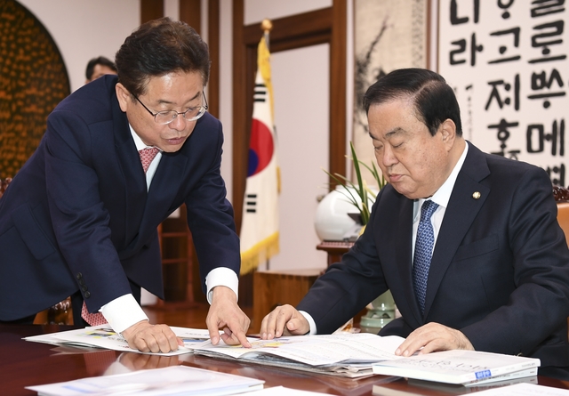 ▲이철우<왼쪽>경북지사가 문희상 국회의장에게 예산관련 브리핑을 하고있다.ⓒ경북도