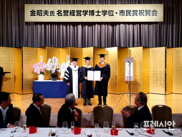 이번 행사는 오랫동안 재일 동포의 권익신장과 모국과의 교류 증진에 앞장선 김소부(73) 회장의 경남과기대 명예경영학 박사 수여를 축하하기 위해 마련됐다. 한창우 마루한 회장 주최로 3일 저녁 도쿄 게이오 플라자 호텔에서 열렸다.