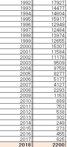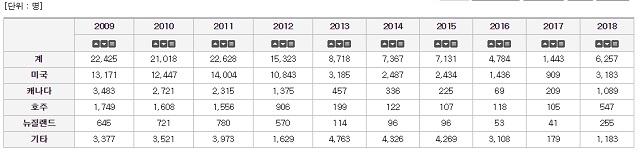 이제 <조선일보>와 황 대표처럼, 해외 이주 현황에서 '현지 이주 신고자'를 제외해 보자. 통계를 보면 '해외 이주 신고자' 역시 계속해 줄어드는 추세에 있다. 다만 2018년 통계 하나가 눈에 띤다. 갑자기 2200명으로 늘었다.