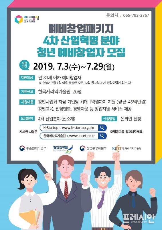 진주 한국세라믹기술원은 4차 산업분야 예비창업자를 대상으로 창업을 지원하는 2019년 예비창업패키지 지원사업 2차 모집을 오는 29일까지 진행한다고 9일 밝혔다.
