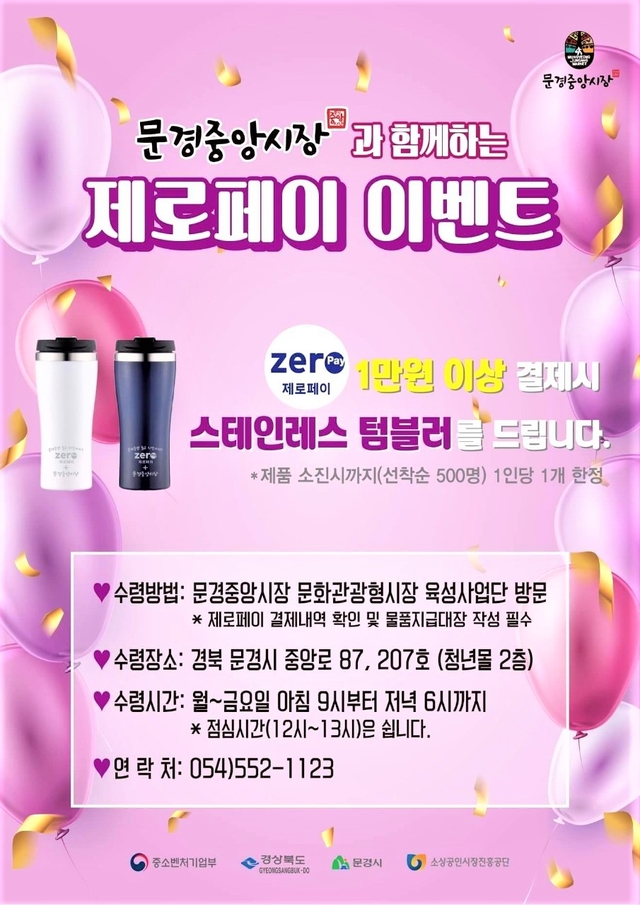 한편, 문경중앙시장 문화관광형시장 육성사업단은 문경시민을 대상으로 제로페이 홍보와 사용 율 확대를 위한 홍보의 일환으로 시장에서 1만원 이상 제로페이로 결제할 시 고급 텀블러를 기념품으로 제공하는 이벤트를 개최하고 있으며, 이 이벤트는 500명 선착순으로 진행될 예정이다.