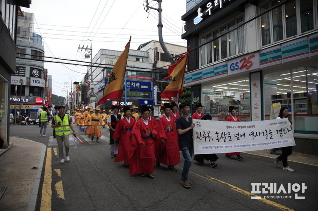 취타대 행진은 조선시대 관리들의 공적인 행차 시 음악을 연주하며 행진하던 행사로 주민협의체에서 진주목사 행차를 재현해 천년의 도시 진주에 대한 자긍심을 시민들에게 일깨워 주는 계기가 됐다.