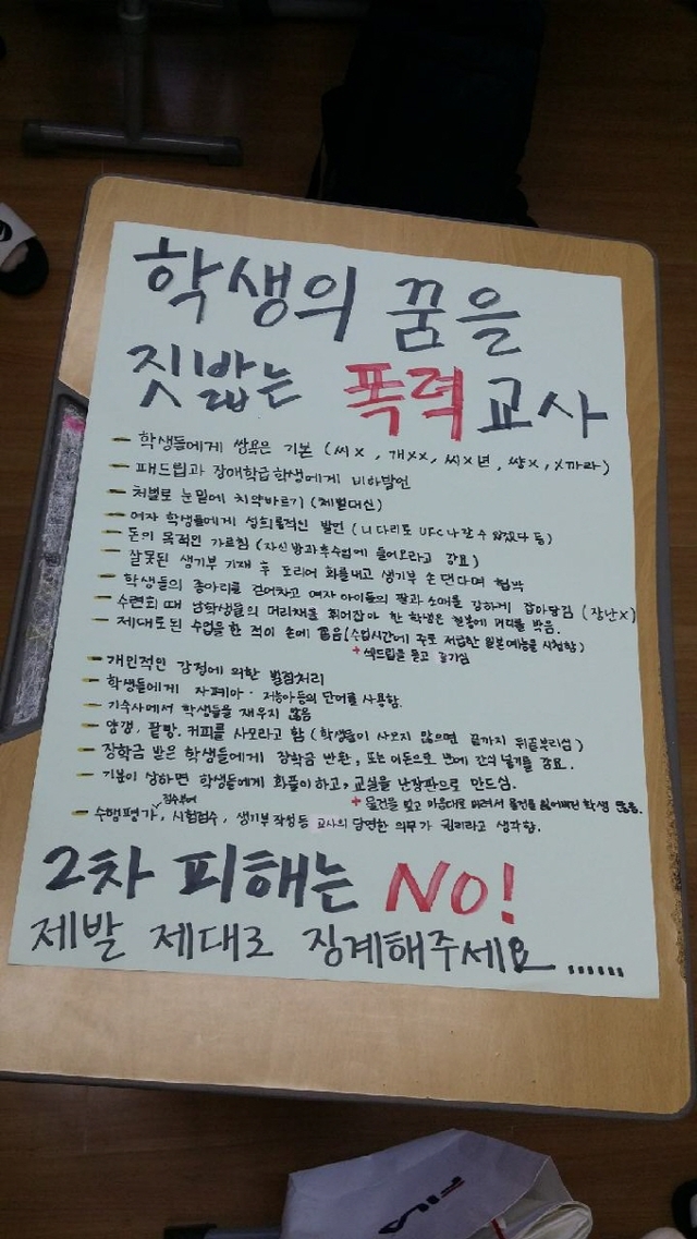 피해학생들에 따르면 학교 선생님이 학생의 꿈을 짓밟는 폭력교사로 아이들을 학대하면서 이를 참다못한 학생들이 대자보를 작성하면서 사건은 알려졌다.