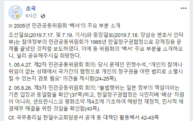 조 수석의 게시물에 따르면, 2005년 4월 열린 제2차 민관공동위원회 회의에서 당시 민정수석이던 문재인 대통령은 "개인의 참여나 위임이 없는 상태에서 국가간 협정으로 개인 청구권을 어떤 법리로 소멸시킬 수 있는지 검토가 필요하다"는 의견을 냈다.
