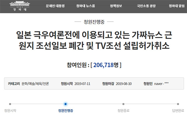 해당 청원 작성자는 지난 11일 청와대 국민청원 게시판에 '일본 극우 여론전에 이용되고 있는 가짜뉴스 근원지 <조선일보> 폐간 및 <TV조선> 설립 허가 취소'라는 제목으로 글을 올렸다.