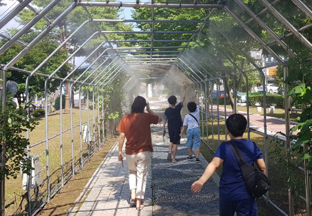 강원 영월군이 30일 많은 군민들이 통행하는 분수대 옆 장미터널에 폭염저감 시설인 쿨링포그(안개분사)를 설치하고 가동에 들어갔다.