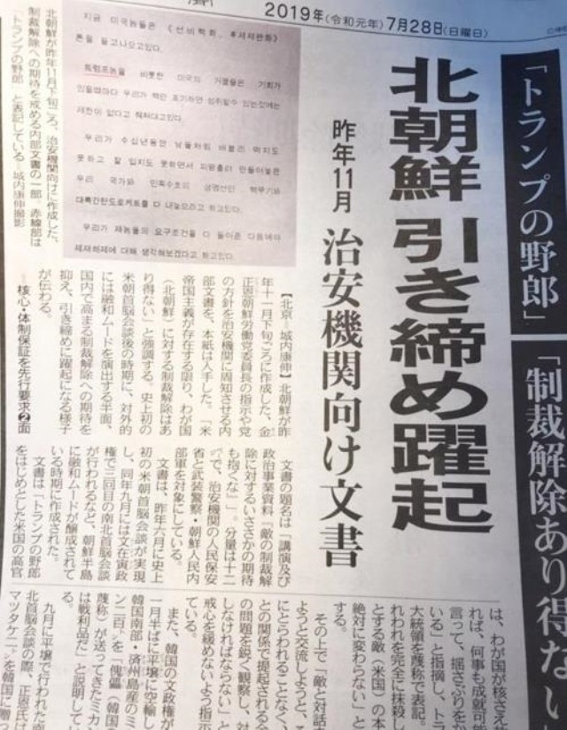 31일 정보당국에 따르면, <도쿄신문>이 지난 28일 공개한 북한의 내부 문건은 글씨체, 줄 간격, 띄어쓰기 등 형식적인 측면에서 북한 내부의 공식 문건과 전혀 다른 것으로 파악됐다.