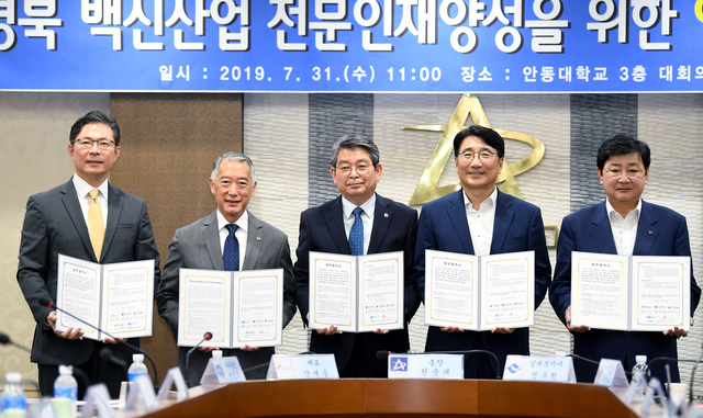 경북도는 31일 안동대학교 본관 회의실에서 ‘백신산업 전문인력 양성사업’의 성공적 추진을 위해 안동시, 안동대학교, SK바이오사이언스, 국제백신연구소(IVI)와 상호 업무협약을 체결했다..