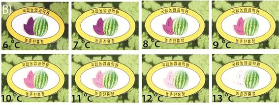 스티커 센서는 9℃∼11℃에서 붉은색이 나타나도록 만들었으며, 6℃ 이하에서는 보라색, 13℃ 이상에서는 회색이 나타난다.