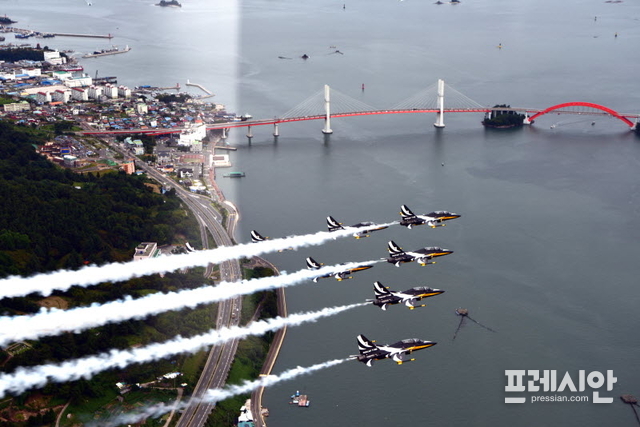 공군 특수비행팀인 블랙이글스가 오는 9일 삼천포대교 일원에서 사천시 랜드마크 항공사진을 촬영한다고 밝혔다.