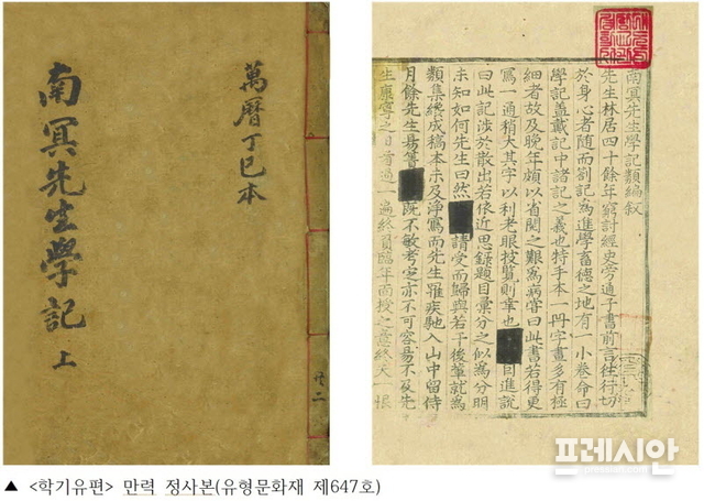 현재 <학기유편> 서문에는 정인홍의 이름이 검은 먹으로 뭉개져 있는데, 남명학파의 굴곡이 심했음을 한눈에 볼 수 있는 귀중한 자료다. 2004년 김포환 씨가 기증했다.