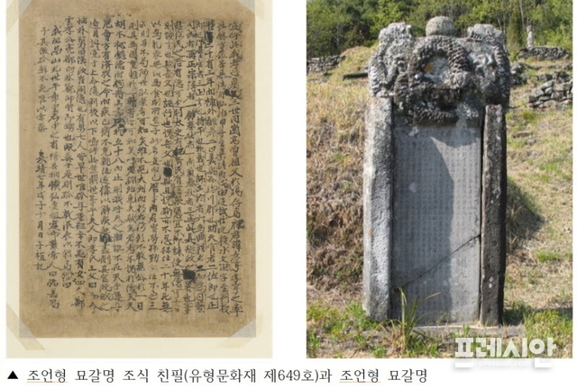 이 묘갈명은 합천군 삼가면 하판리 조언형 묘소 앞에 세워져 있다. 남명 조식은 한국 유학사에서 차지하는 위상에 비해 남긴 문헌이 많지 않은데 저술보다 실천을 중시한 유학자이기 때문이다. 친필 원고는 더욱 극소수로 남아 있어 이번에 문화재로 지정된 것이다.
