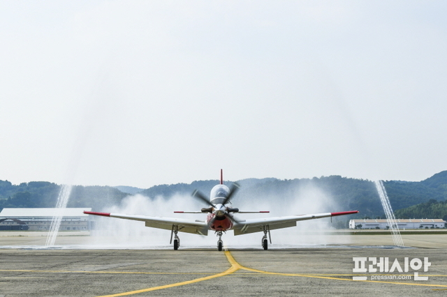 경남 사천 공군 제3훈련비행단은 8일 KT-1 항공기 린스 작업을 실시했다.