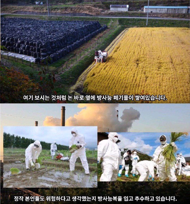 사진을 잘 들여다보면 영상에 들어간 자막 같아 보인다. 설마 정규 방송에서 다뤘을 리는 없겠고, 아마도 유튜브 같은 데 올라온 영상의 한 장면이 아닌가 싶지만, 어쨌든 원본 영상은 찾지 못했다.(어쩌면 유튜브 속성을 보아 비슷한 영상들이 한둘이 아닐 수도 있겠다.) 자막엔 버젓이 '쌀을 추수하고 있다'는 설명이 붙어 있다. 이 글을 읽는 누구나, 당연히 후쿠시마에 거주하는 농부들이 저렇게 방호복을 입은 채로 농사를 짓고 추수를 하고 있다고 착각할 수밖에 없을 것이다.