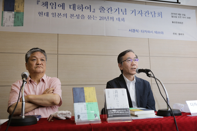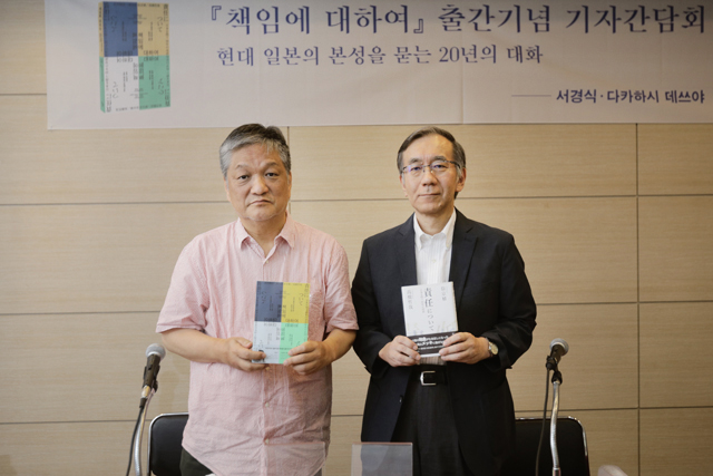 12일 서경식 도쿄게이자이대학 교수와 다카하시 데쓰야 도쿄대학 교수가 서울 종로구 출판문화협회 출판문화회관에서 기자간담회를 열어 현 일본 체제를 비판했다. 둘의 세 차례에 걸친 대화를 엮은 대담집 <책임에 대하여>(한승동 옮김, 돌베개 펴냄)의 국내 출간을 기념하는 자리로 이번 행사가 마련됐다. (☞관련기사 : 일본의 민주주의는 '도금' 수준)
