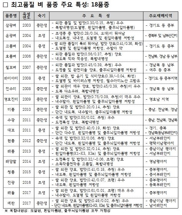 먼저, '최고품질 쌀'은 밥맛, 외관, 도정 특성, 내재해성의 네 가지 엄격한 기준에 따라 육성된다.