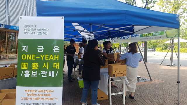 국내 최초 국립대학교 국유재산을 임대해 농사를 짓는 ONE-YEAH(원예) 협동조합이 지난 12일 전북대 건지광장에서 직접 재배한 멜론을 홍보하고 판매하는 행사를 가졌다.