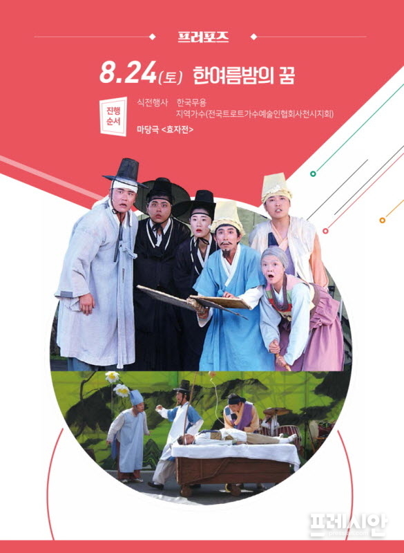 사천문화재단에서 주관하는 2019토요상설무대 프러포즈 9회차 공연 ‘한여름밤의 꿈’이 오는 24일 오후 7시 삼천포대교공원에서 펼쳐진다.