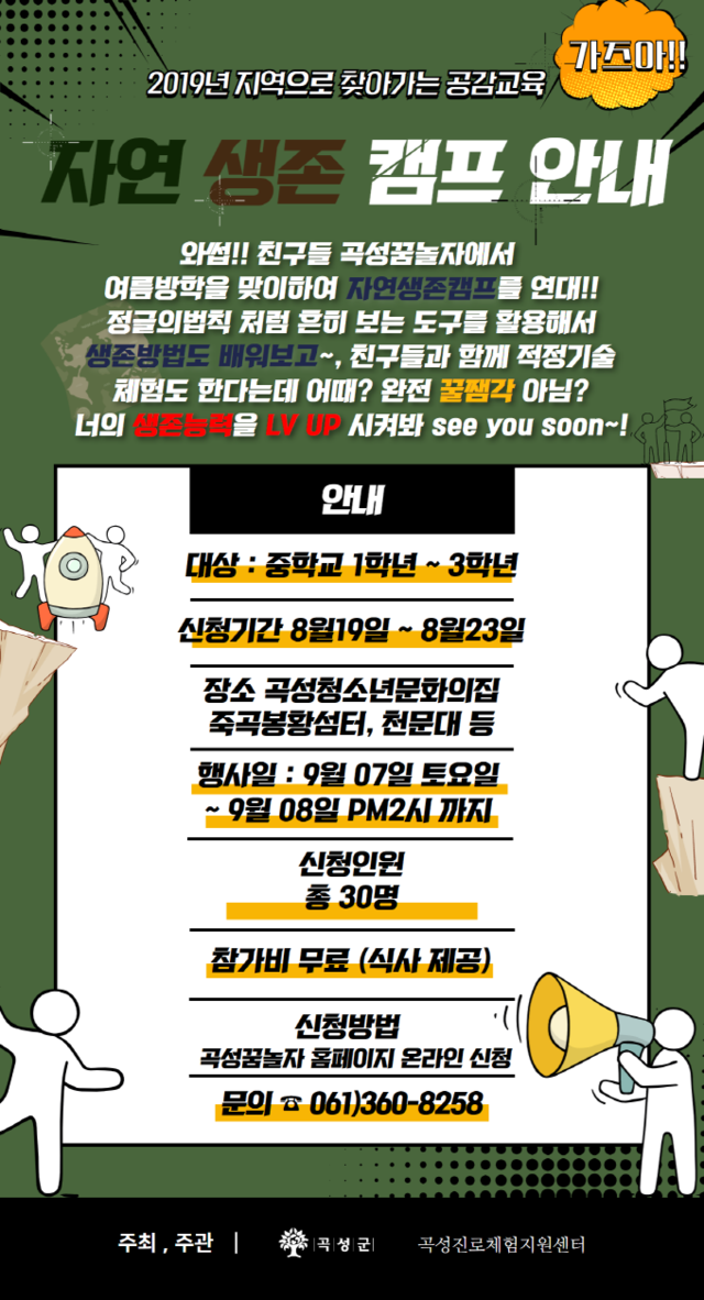 곡성군(군수 유근기)이 오는 19일부터 23일까지 청소년 자연 생존캠프 신청자를 모집하고 있다고 밝혔다.