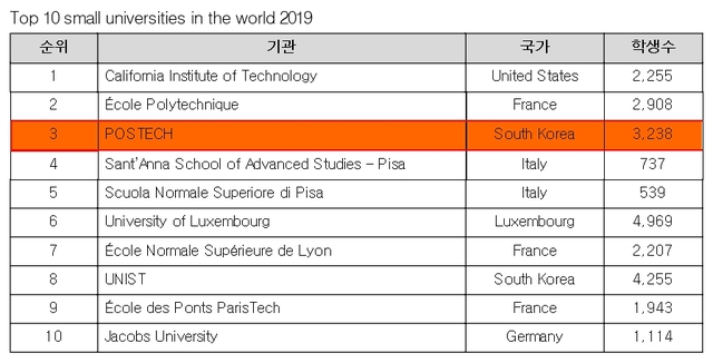 1위는 미국의 칼텍(Caltech)이 차지했으며, 2위는 에콜 폴리테크니크(École Polytechnique)가, POSTECH은 3위에 올랐다. 이 순위는 아시아 대학 가운데 가장 높은 순위다.
