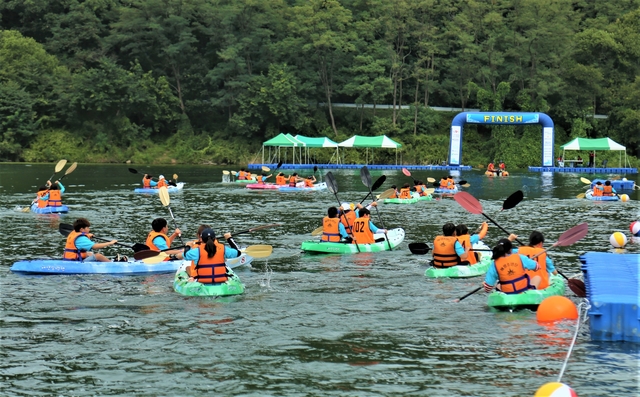 ▲ 어린이 수상안전 경기대회, 카약 낙동강 건너기 참가자들이 강을 가로질러 힘차게 나아가고있다.ⓒ경북도