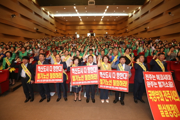 완주군 새마을부녀회장과 이서면 항공기운항 반대위원회 등 500여명은 26일 오후 완주군청 문화예술회관에서 ‘전주항공대대 완주군 상공 헬기운항 반대’ 5차 결의대회를 개최했다.