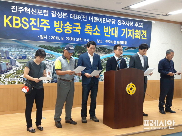 진주혁신포럼 회원들이 27일 진주시청 브리핑룸에서 기자회견을 열고 “KBS 경영진은 지역국 축소와 통폐합이 아니라 지역국 기능 확대와 방송콘텐츠 경쟁력 강화를 통해 KBS를 혁신하라”고 촉구했다.