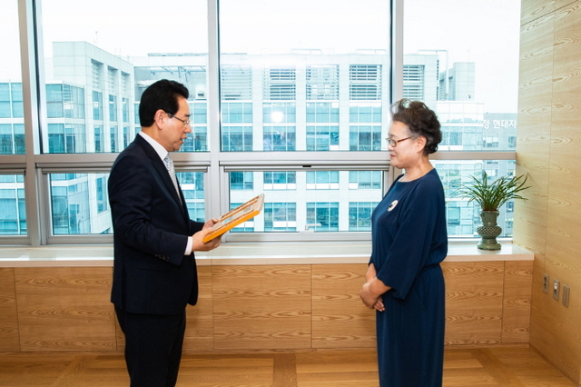 김영록 전라남도지사가 지난 4일 서울 송파구에 위치한 대명그룹 본사를 방문해 박춘희 회장에게 ‘쏠비치 호텔&리조트 진도’ 조성을 통해 전남 서남해안권 관광산업의 초석을 다져준 것에 대한 감사의 마음을 담은 감사패를 전달했다.