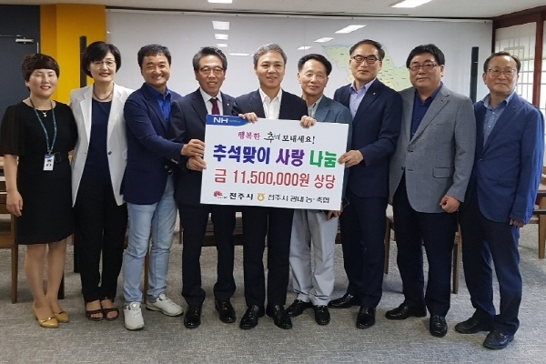 농협전주완주시군지부 홍종기 지부장과 전주시 관내 농·축협 조합장 일동은 "민족 고유의 최대명절인 한가위를 맞아 지역사회의 소외이웃들이 소박하지만 넉넉한 추석을 보낼 수 있으면 좋겠다"며 "지역사회 복지사각지대에 놓인 소외이웃들을 위한 나눔 문화 확산운동을 지속적으로 전개하겠다"고 전했다.