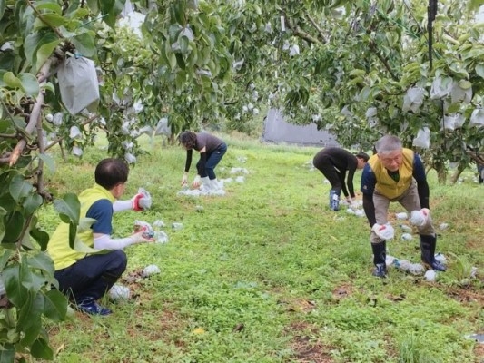 농업기술센터 직원들과 농협중앙회 군산시지부 직원 등 40여명은 태풍의 영향으로 낙과 피해를 입은 관내 배 재배 농가 4곳에서 떨어진 배를 수거하고 지지대를 세우는 등 일손을 보탰다.