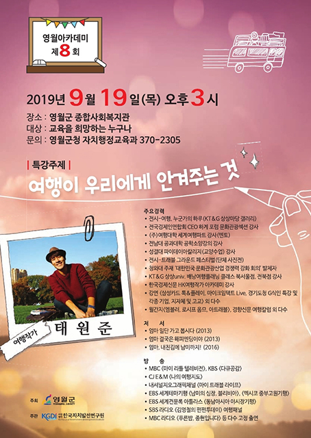 영월군은 오는 19일 오후 3시 영월군종합사회복지관에서 태원준 여행작가를 초청해 ‘여행이 우리에게 안겨주는 것’ 이라는 주제로 영월아카데미를 연다.