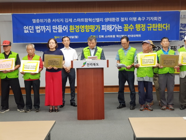 대책위는 따라서 혈세 1억4000만원이 들어간 소규모 환경영향평가 보고서의 공개'와 '환경청 협의 멸종위기종에 대한 엉터리 보존대책의 전면 보완', '농식품부와 전북도의 농지법 시핼령 개정 배경과 처리과정의 공개' 등을 촉구했다.