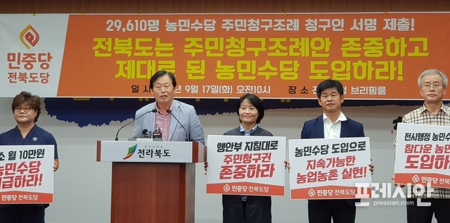 민중당 전북도당은 17일 전북도청에서 기자회견을 갖고 농민수당 조례안 제정과 관련해 전북도가 도의회에 제출한 "전북도 조례안을 철회하고, 농민단체가 제출한 '전북도민 주민청구조례안'을 발의할 것"을 촉구했다.