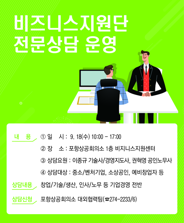 전문상담은 중견기업, 중소/벤처기업, 소상공인, 예비창업자 등 누구나 신청 및 상담이 가능하며, 상담을 원하시는 업체는 포항상공회의소 대외협력팀(☎274-2233/6)으로 신청하면 된다.