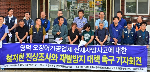 대구경북 이주노동자인권·노동권실현을 위한 연대회의는 17일 고용노동부 포항지청 앞에서 ‘영덕 오징어가공업체 산재사망사고의 철저한 진상조사와 재발방지 대책 촉구’를 위한 기자회견을 열었다.