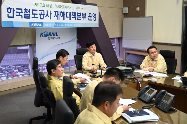 코레일은 20일 오후 대전사옥 운영상황실 재해대책본부에서 제17호 태풍 ’타파’ 대비 긴급 안전대책회의를 열고 재해 예방 대책을 점검했다.